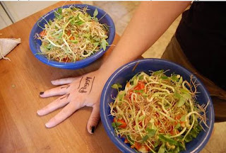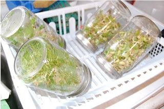 We use a dish rack because we make so much. The one in front is lentils, the other three are black eyed peas, all have been going for about four days when this picture was taken.